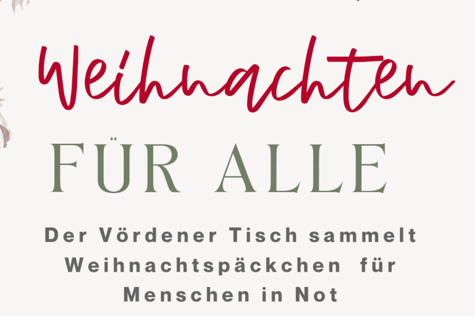 Ein „Weihnachten für alle“ wünscht sich das Team des Vördener Tisches und bittet die Bürgerinnen und Bürger der Stadt Marienmünster, es bei der Erfüllung dieses Wunsches zu unterstützen. Möglich ist das mit einer „Weihnachtsspende.“ Gern genommen werden offene Päckchen mit haltbaren Lebensmitteln. Gefragt sind auch… Weiterlesen »Der Weihnachtswunsch des Vördener Tisches